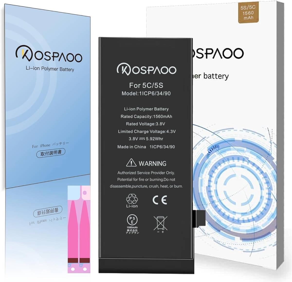 - KOSPAOO for iPhone 5S 5C バッテリー 互換 標準容量 1560mAh 3.8V 日本語説明書 PSE認証 電池交換動画付き 交換用リチウムバッテリー