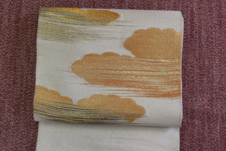 > きもの今昔6916 袋帯 西陣織 織機綴れ織 太鼓と前腹に柄 黄金の雲取りに横霞柄 帯の長さ435cm
