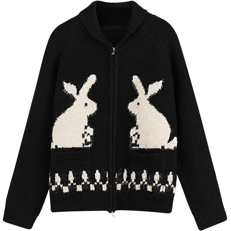 - 織り込みウサギ模様 着映え セーター おしゃれ レディース ゆったり チュニック 暖かい ブラック LD028