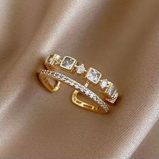 - ジルコンダブルリング 指輪 レディース ゴールド 韓国 サイズフリー ファッション キレイ 華奢 ジルコニア 人工ダイヤ 新品