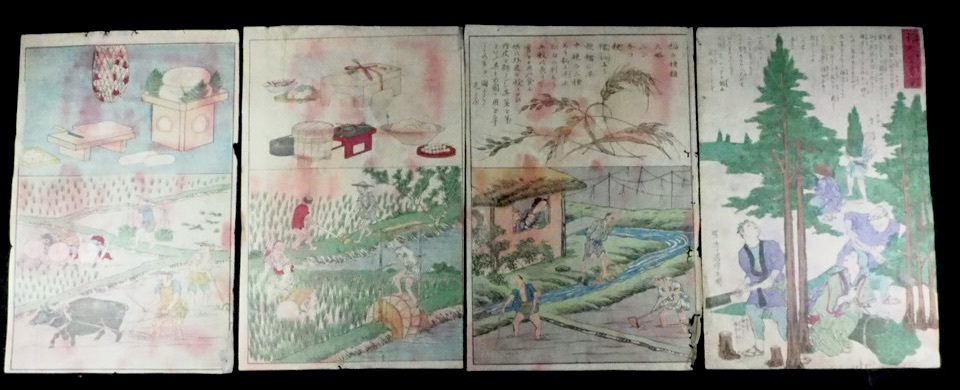 - 教材画 文部省教育錦絵 浮世絵木版画「稲の種類」「杉の生育方」 SMN604(20-9)