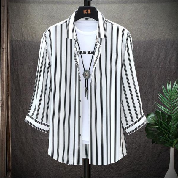 - 人気推薦 メンズシャツ 半袖シャツ メンズ ストライプ柄 七分袖 シャツ 薄手 爽やか レーヨントップス 紳士 ビジネス 通勤 サマー 細身 / A