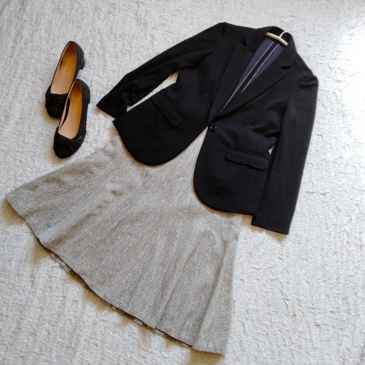 > 自由区*ツイードスカート*大きいサイズ44*シルク・リネン混*絹麻*フレアー*オンワード樫山*ラメ入り*フォーマルにも*膝下丈*W74