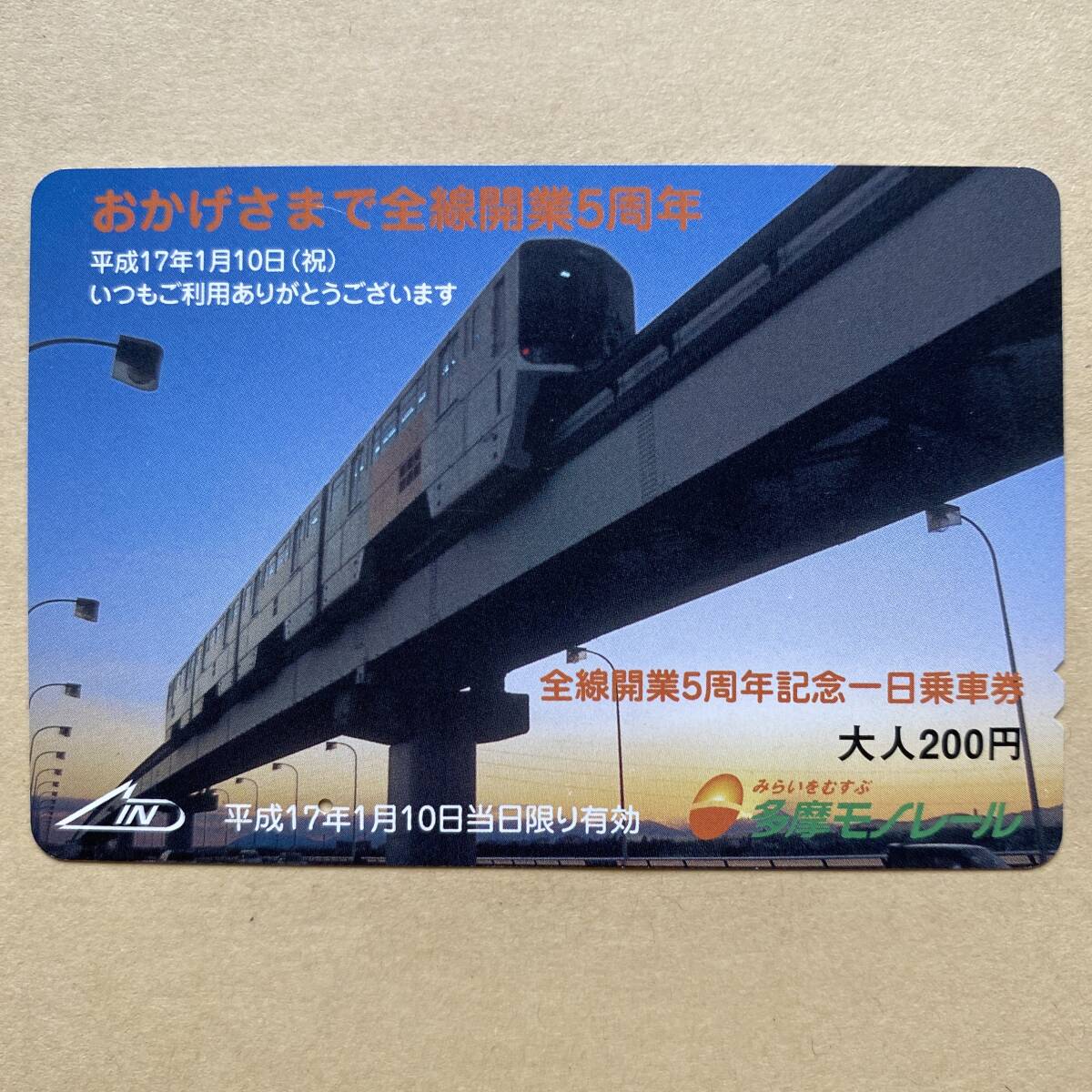 - 【使用済】 全線開業5周年記念一日乗車券 多摩都市モノレール おかげさまで全線開業5周年