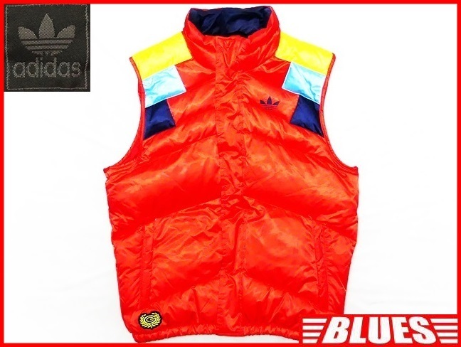 > 即決★adidas★メンズM ダウンベスト アディダス トレフォイル 赤 レッド アウトドア 登山 ジャケット キャンプ 3本ライン カラフル
