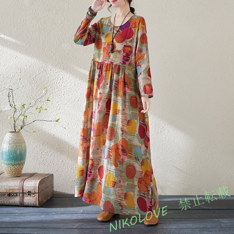 - 新品レディース ゆったり大きいサイズ カジュアル綿麻 プリント柄 長袖ロング丈ワンピース L~XXL オレンジ色 LH486