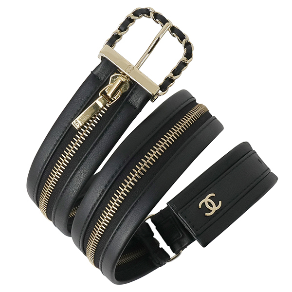- シャネル ベルト ファスナー ジップ チェーンバッグル ラムスキン ブラック h-k312