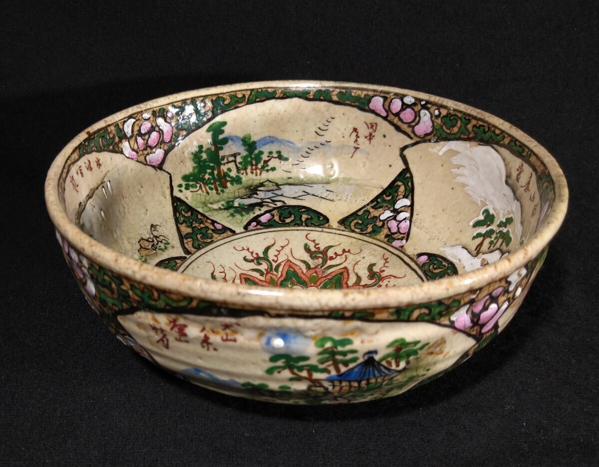 - 九谷焼 色絵 花文 風景図 19cm 深鉢 b-10b3686