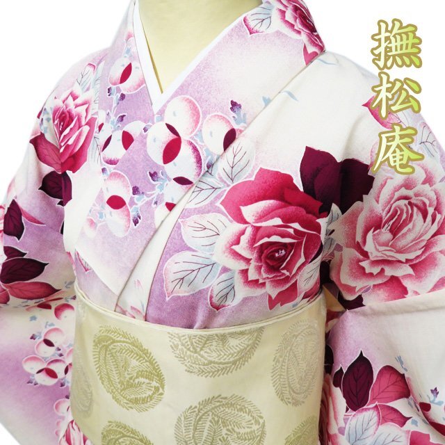 > 夏物 浴衣 小紋 着物 中古 ポリエステル 撫松庵 花模様 薔薇 オフホワイト 赤紫系色 多色 身丈164cm 裄68.5cm L きもの北條 A1040-5