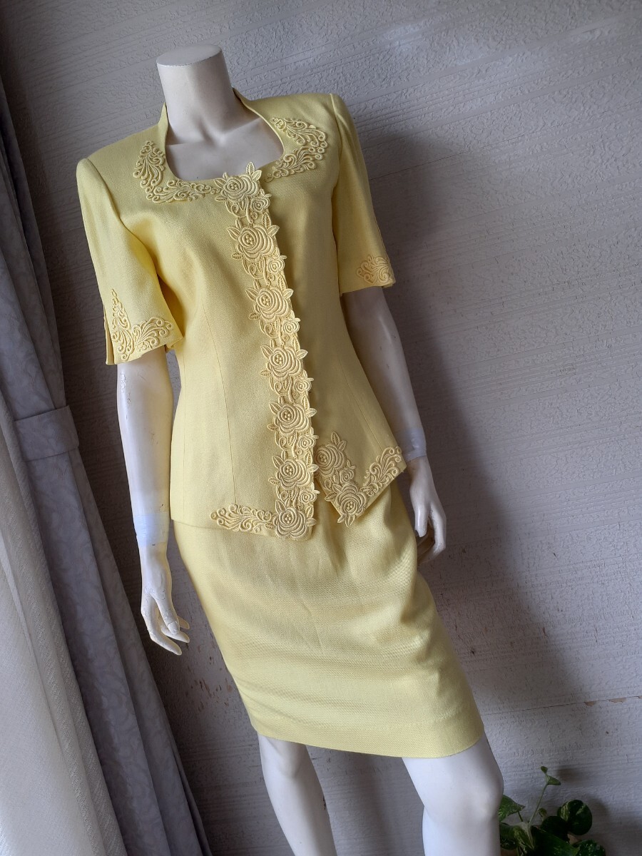 - 銀座マギー*Maggy マギー★美品★スカートスーツ★立体レース仕様★まろやかなイエロー系★9号