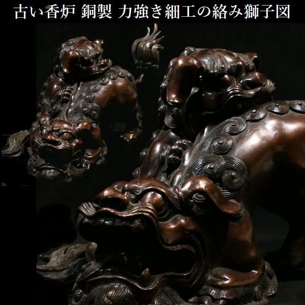 【 恵 #1194 】 古い香炉 銅製の力強き細工の一品です! 絡み獅子図 香炉 検:香道/香道具/茶道/茶道具拍卖