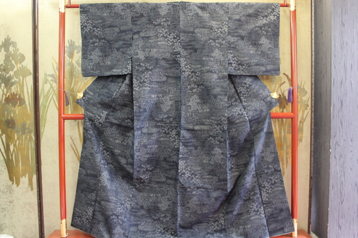 > きもの今昔7199 紬のきもの バチ衿袷仕立 十日町紬横糸に節糸使い母屋に樹木風景柄 高級感ある大島柄 身丈156CM