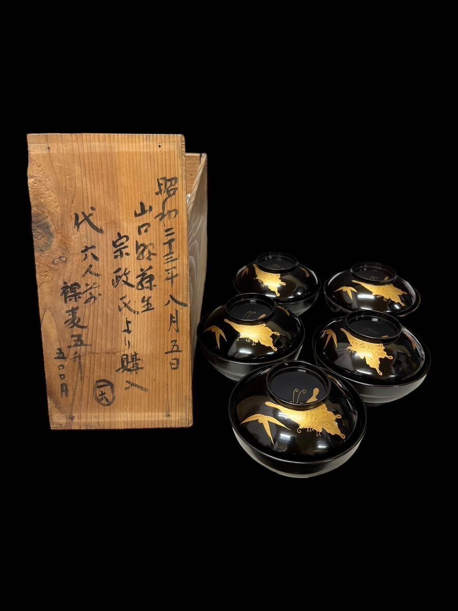 - A10384 江戸期 吸物碗 池田家 揚羽蝶 家紋 花柄 5脚