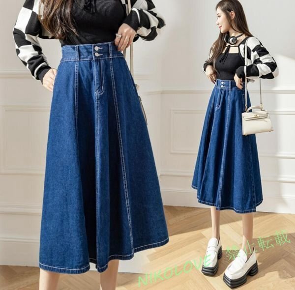 - 新品あす楽 デニムスカート フレアスカート Aライン マキシ デニム マキシ丈 スカート ミモレ丈 膝下 ロングスカート L LJ001