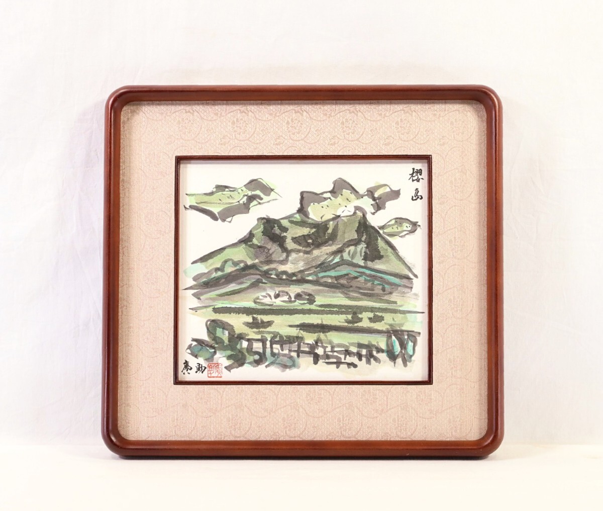 - 「模写」田崎廣助 水彩「桜島」画寸27×24cm 福岡県出身 日本芸術院会員 鹿児島市街地と錦江湾そして雄大なる桜島のその勇姿 田崎広助 9325