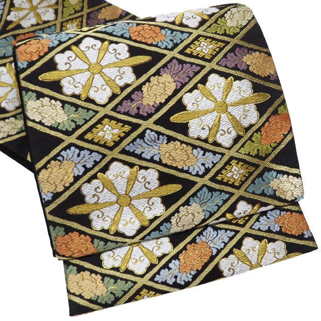 - 袋帯 中古 リサイクル 正絹 フォーマル 仕立て上がり 六通 花菱模様 黒色 多色 金 きもの北條 A1053-10