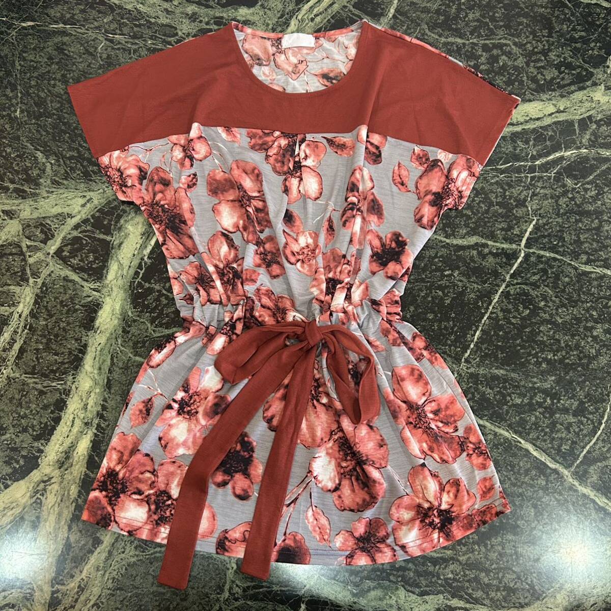 > 【美品】Gleeful★半袖チュニック Mサイズ程度 花柄 赤系 グレー トップス フレンチスリーブ レディース