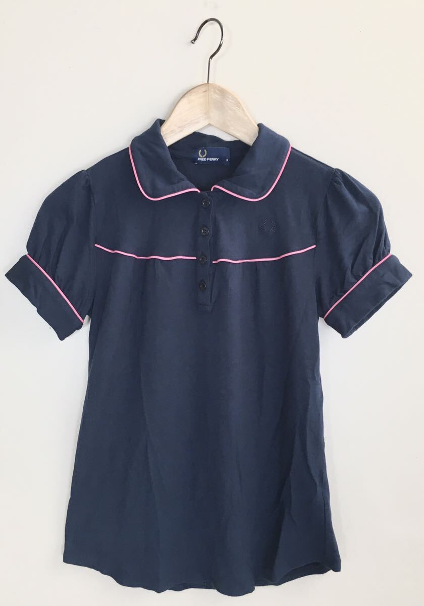 - ● FRED PERRY ◆ パイピング ポロシャツ (ネイビー/ピンク Sサイズ) パフスリーブ 半袖 シャツ カットソー フレッドペリー ◆W5 MQこ9N-23