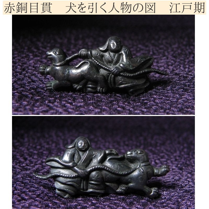 - 時代武具 赤銅目貫 犬を引く人物の図 桐箱付 江戸時代/24g071