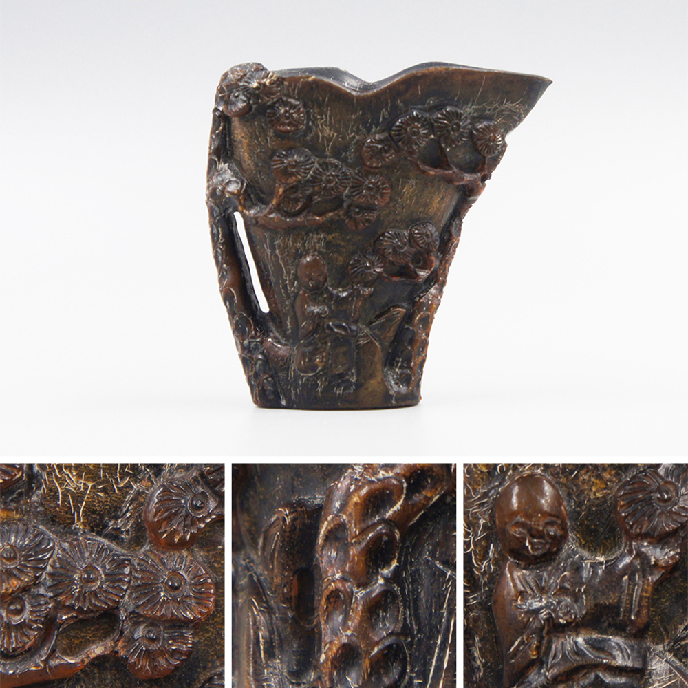 > 【中国美術】 ★ 文房 満彫松下童子犀角盃 ★ 清朝期 樹木 人物 彫刻文様 清供雅玩 検 清代清時代李朝置物道具唐物骨董古美術古玩古董