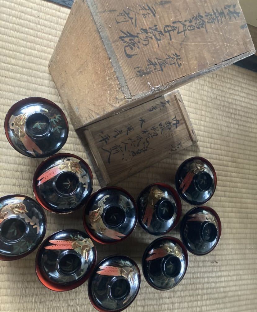 - 【送料無料】輪島塗 漆器 木製 緑塗 蓋付きお椀 椀 金蒔絵 鳳凰の図 9客 セット