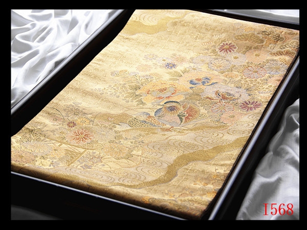 - I568厳選西陣 振袖可 花鳥吉祥紋 金色地 華やぎの品格 六通正絹純金糸高級美術袋帯 ◇検簪着物名古屋帯帯締め