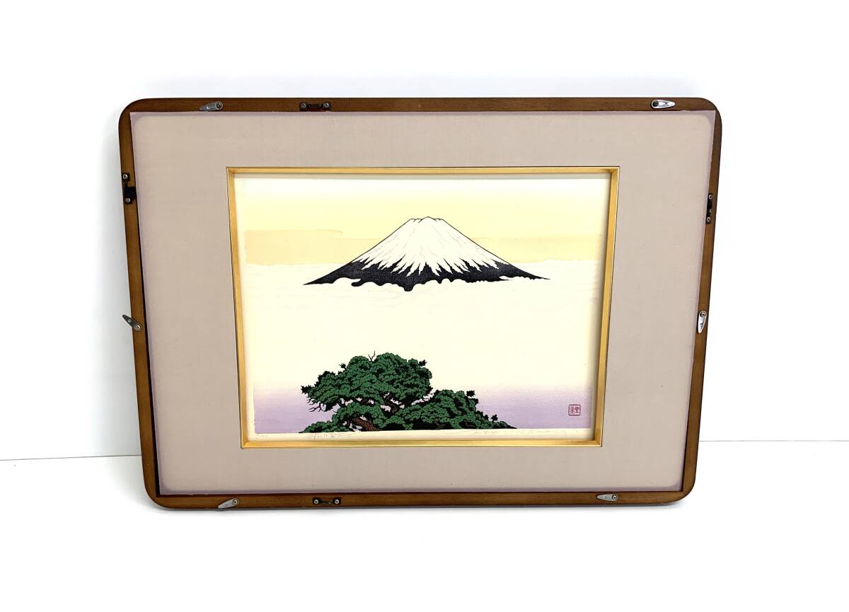 - ○29【真作】日下里美 《松に富士》1984年 木版画 8/125 ’89 作者自筆サイン 落款 satomi 額装