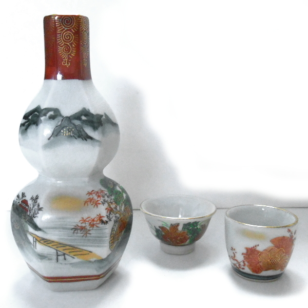 - 九谷焼★陶山 六角瓢型徳利 山水文様 盃 陶香等 花文様 2種セット