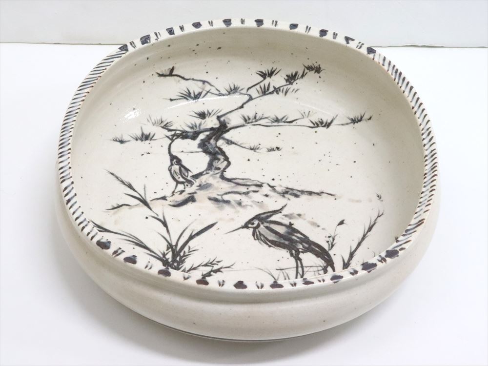 - 【真作】榎本響介 造 志野織部 鷺文 中鉢 共箱 栞 幅31cm A3703