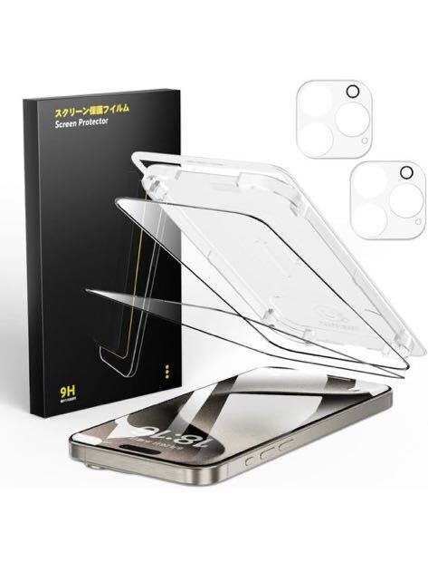 - ガラスフィルム iPhone 15 Pro 用 【超強力な保護力・貼り付け超簡単】保護フィルム 2枚 + カメラフィルム 2枚 旭硝子素材製 ガイド枠付き