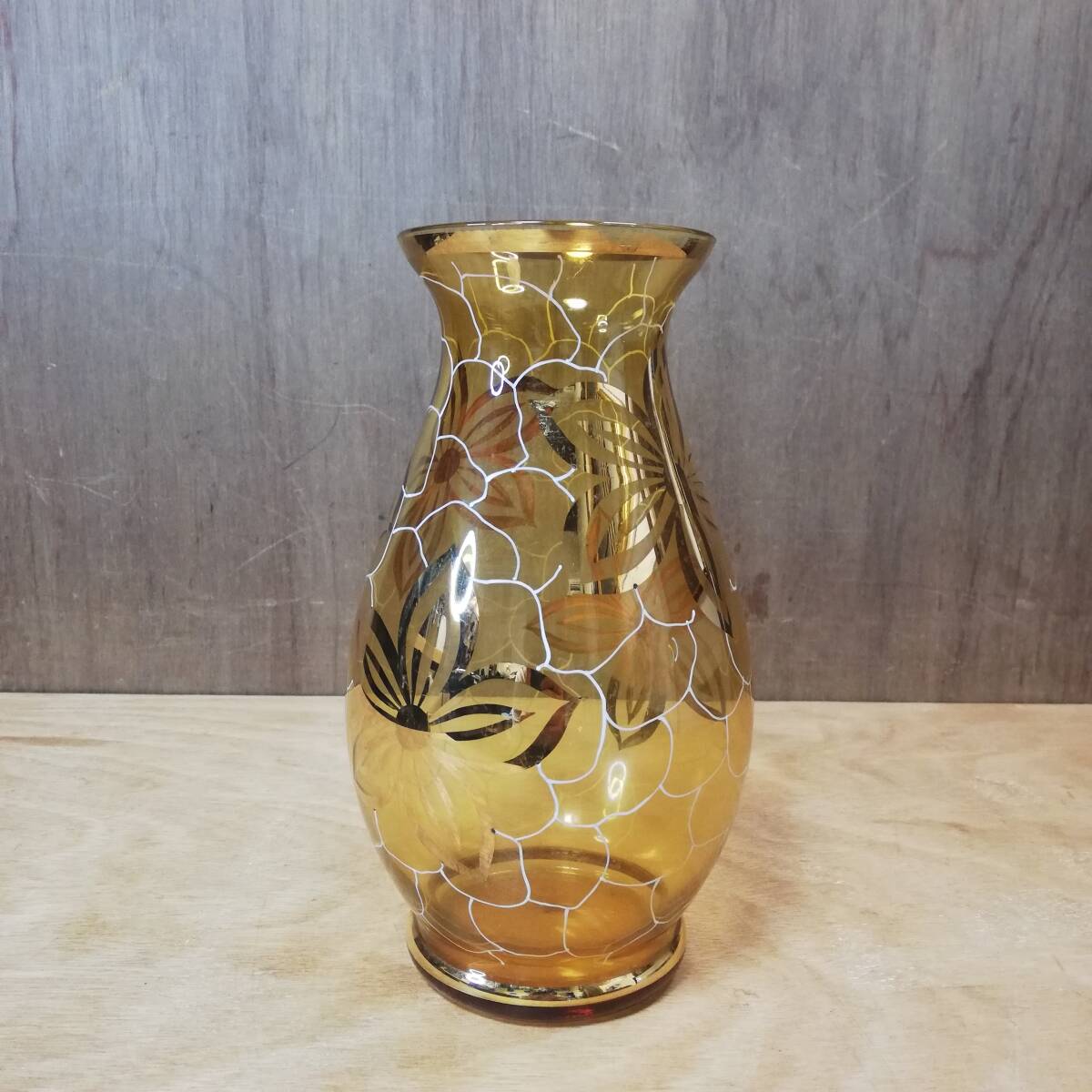 - チェコ製 花柄 金彩 琥珀色 ボヘミアグラス 花瓶 ガラス 高さ24cm