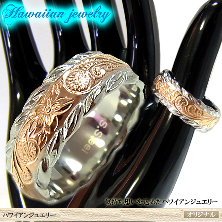 > ★インスタ映え★ハワイアンジュエリー★金属アレルギー&温泉&海水浴ご使用OK★ステンレスリング★ピンクゴールドプルメリア&カレイキニ★