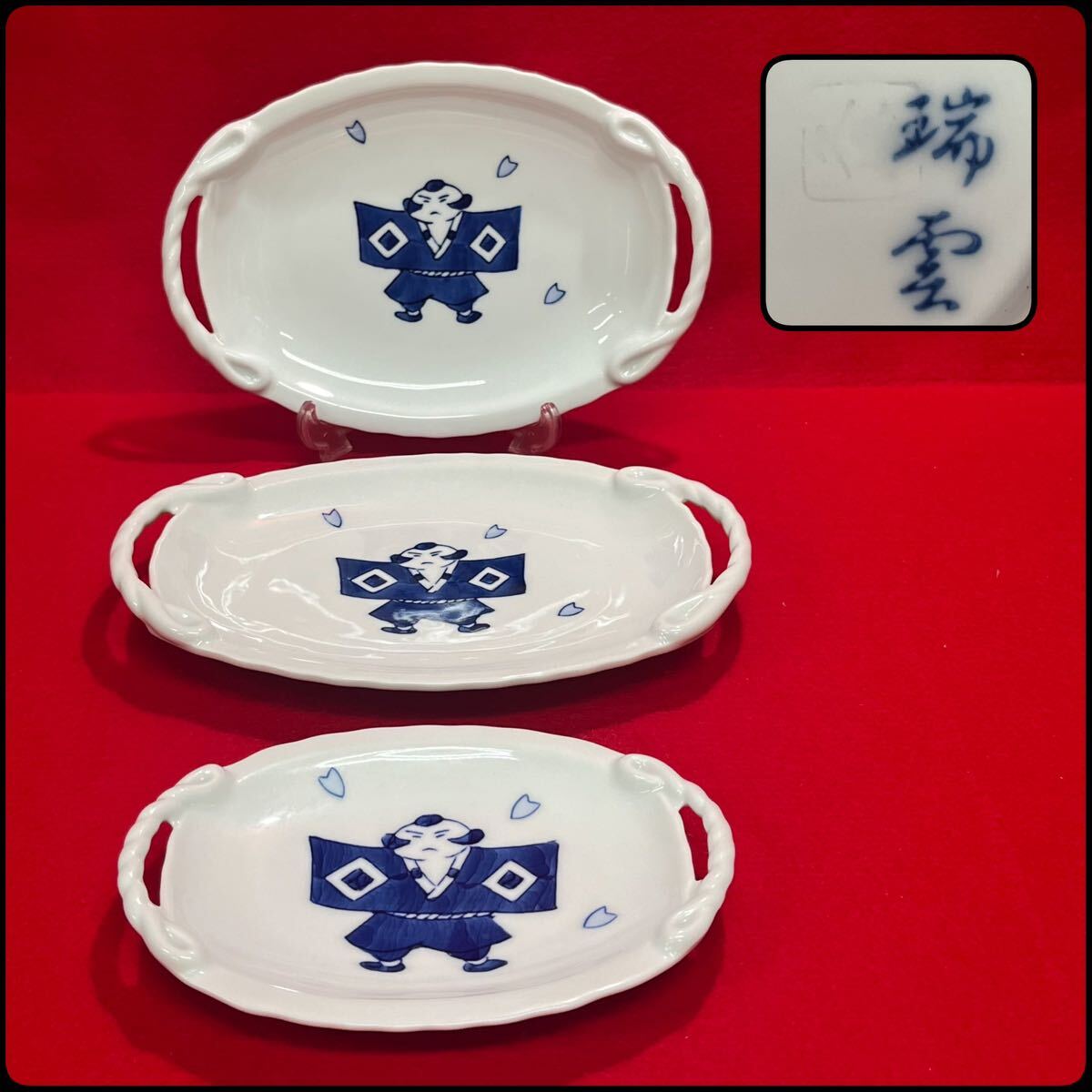- 有田 瑞雲 久峰 染付 やっこさん プレート 3客 取手付 菓子皿 飾り皿 レトロ 和食器 小皿 (08226T