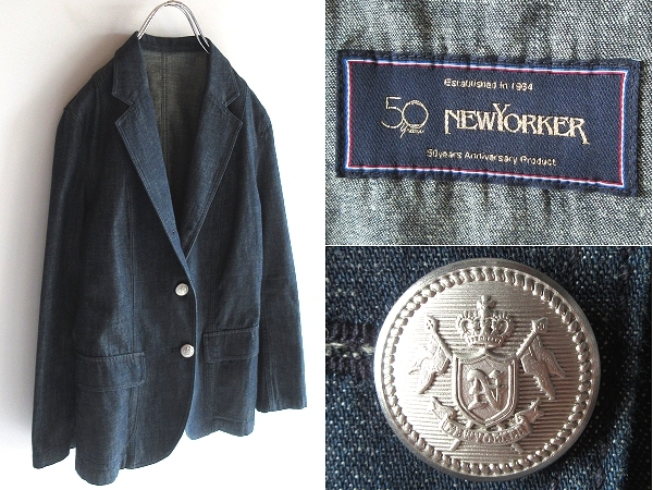 > 美品 定価36900円 NEWYORKER ニューヨーカー 50周年 限定 銀ボタン デニム ブレザー 段返り 3B 2Bテーラードジャケット 9AR インディゴ