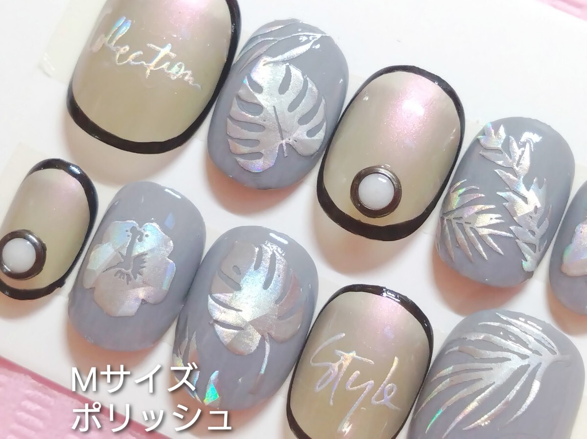 - Mサイズベリーショート・グレー系カラーポリッシュベースリーフ柄シアーグレーネイルチップつけ爪ハワイ