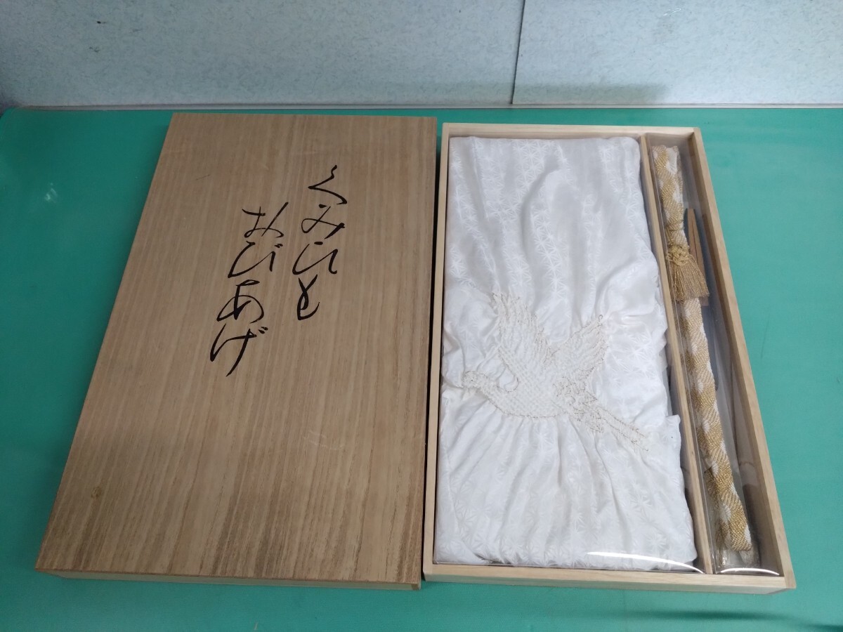 - ● 高級 絞り 鶴亀 三点 セット 金彩 帯揚げ 帯締め 扇子 亀 飾付 麻の葉模様 婚礼 結婚式 祝い事 縁起物 箱入 中古 ①