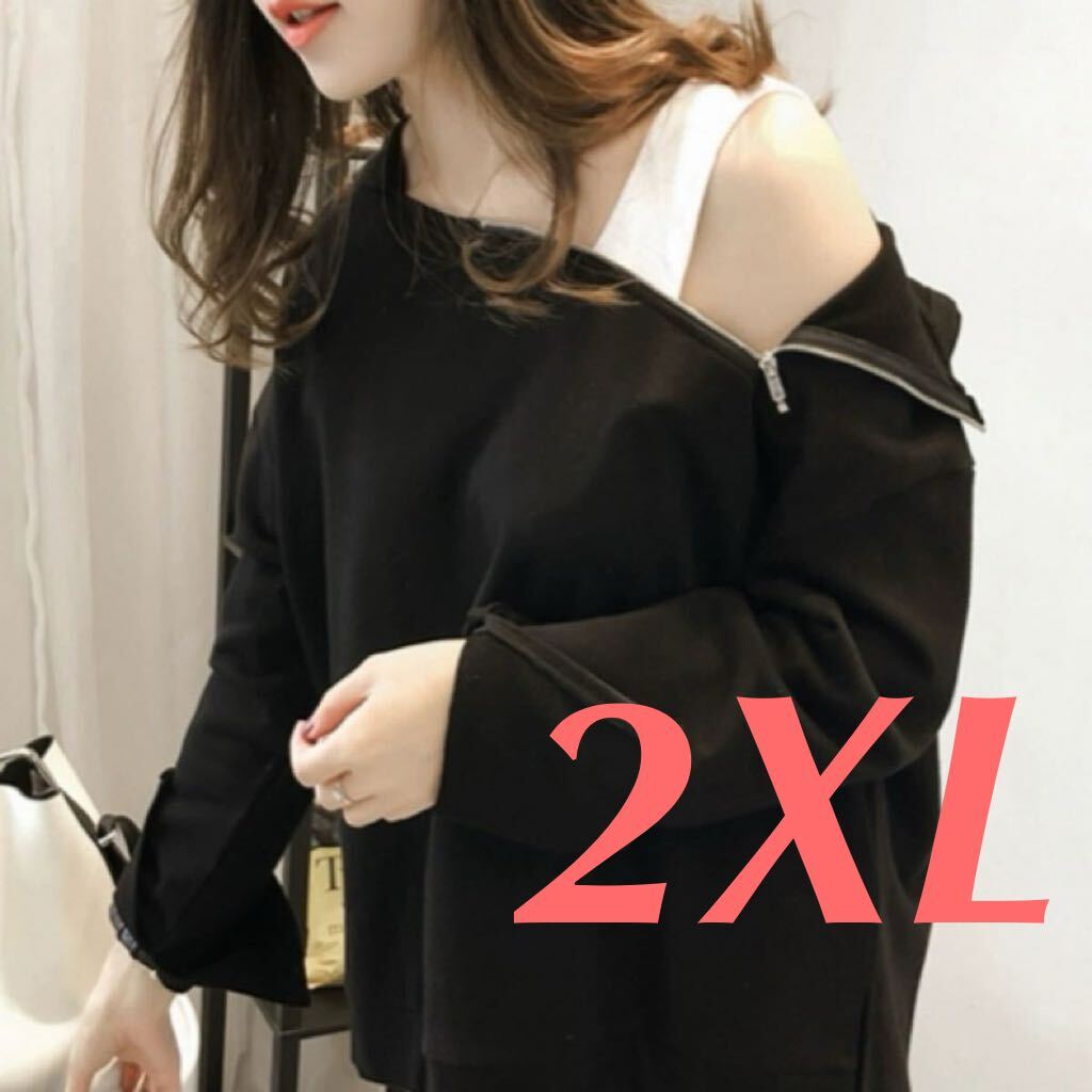 > オフショルダー パーカー 2way ジップ 長袖 トップス フード プルオーバー ブラック 小さめ 寸法確認 トレンド 人気 ストリート 黒 2XL