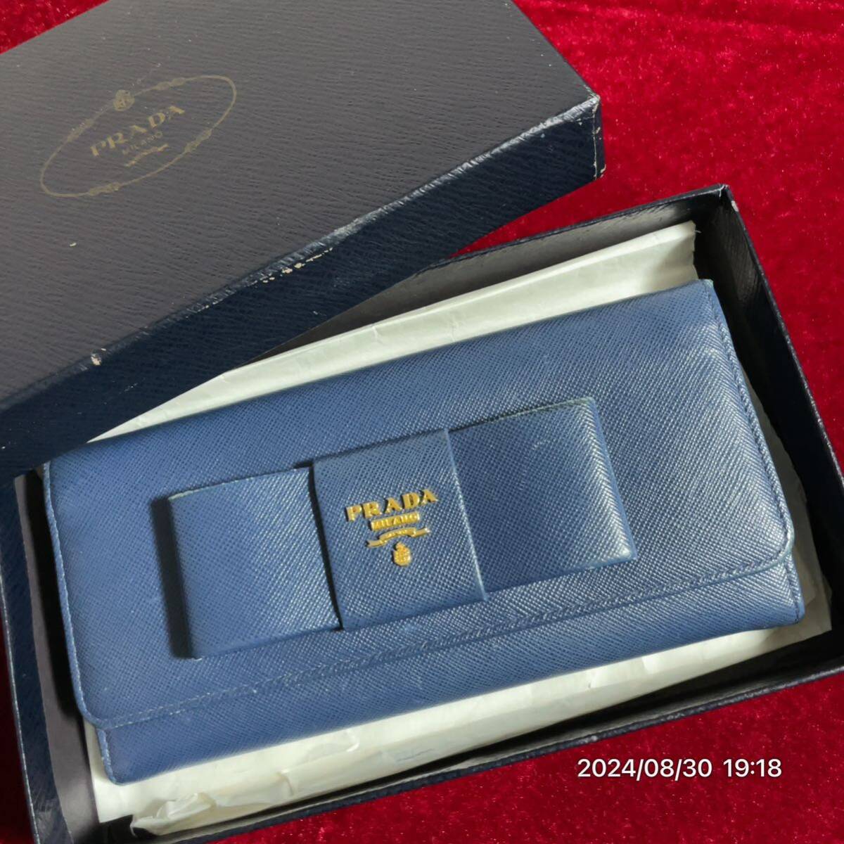 - PRADA プラダ リボン ブルーカラー レザー 革 二つ折り ウォレット 長財布 箱付