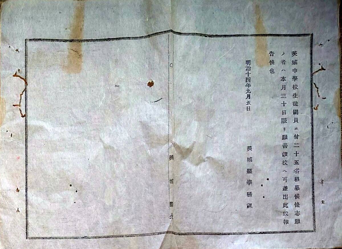- f24090649〇明治布告布達 茨城中学校生徒募集 現水戸第一高等学校 茨城県 明治14年〇和本古書古文書