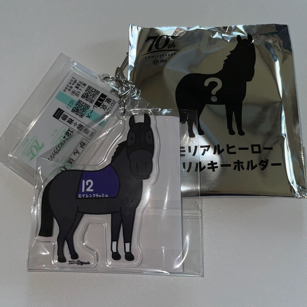 - エイシンフラッシュ Welcomeチャンス メモリアルヒーローアクリルキーホルダー JRA ノベルティ 抽選 ウェルカムチャンス 競馬