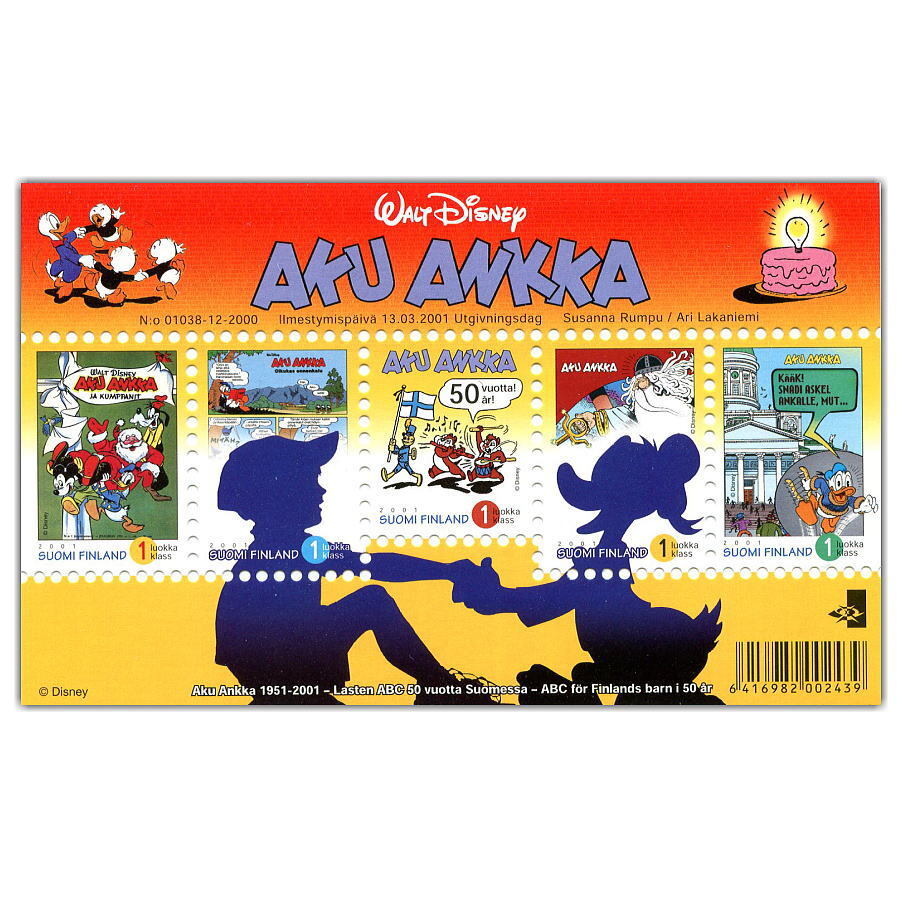 - ディズニー ドナルド 切手5枚1シート(Aku Ankk) 発行国フィンランド 2001年発行