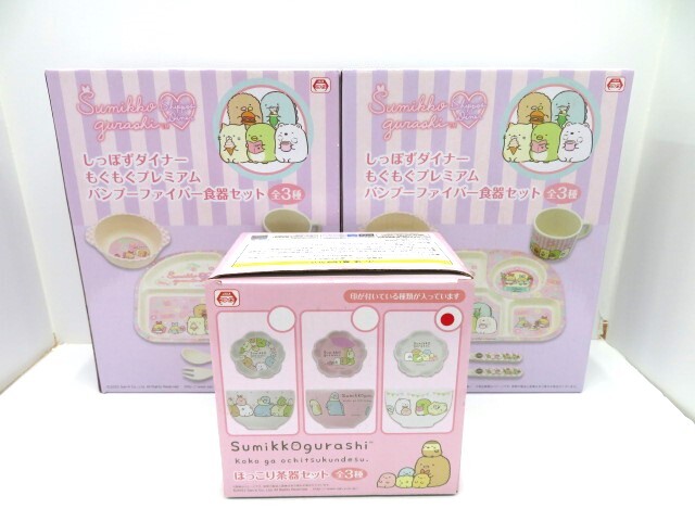 > [あ1] 未使用 すみっコぐらし バンブーファイバー 食器セット パープル2セット & ほっこり茶器セット 計3セット 箱付き