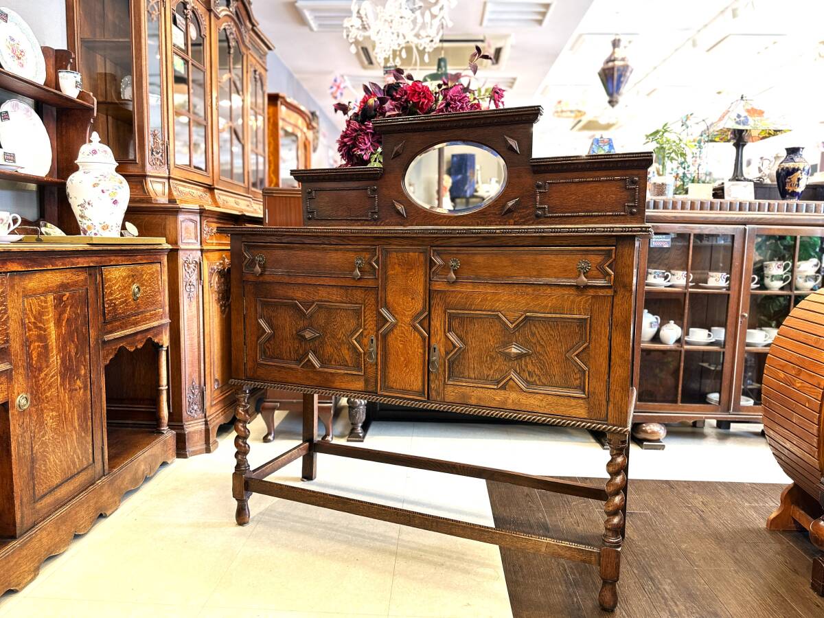 - 4I16 イギリスアンティーク ジャコビアン様式 ツイストレッグミラーバックサイドボード キャビネット