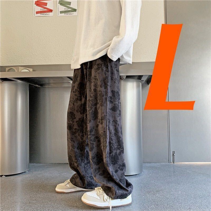 - ワイドパンツ 花柄 レトロ調 イージーパンツ ボトムス ルーズパンツ パンツ メンズ レディース ワイドレッグ トレンド ストリート 黒 L