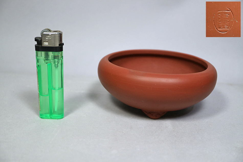 - b56) 小品 盆栽鉢「一陶園」・常滑焼・胴経/約12cm 高さ/約4.8cm 三脚付 丸鉢 小鉢<在銘 朱泥 緑泥 黄泥 紫泥 烏泥 植木鉢 山野草鉢 蘭鉢