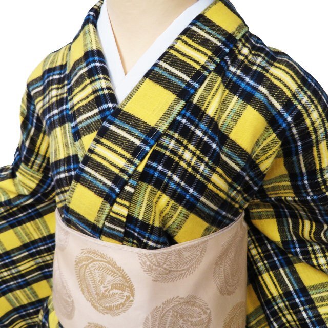> 播包 新品 播州織 着物 木綿 冬物 単衣 カジュアル 格子模様 反端付き 黄色 黒色 青色 身丈161cm 裄66.5cm M きもの北條 A1090-5