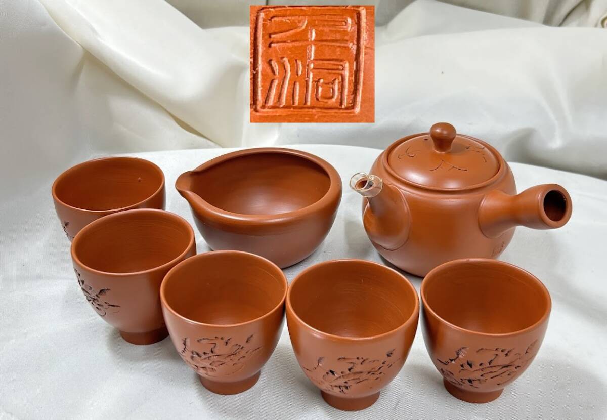 - 常滑焼 渡辺千洞 千洞 在銘 朱泥 釘彫 蟹 横行入士紋 横手急須/茶注 湯冷/湯呑 茶道具 used 未使用 コレクション 箱無 伝統工芸 自宅保管品