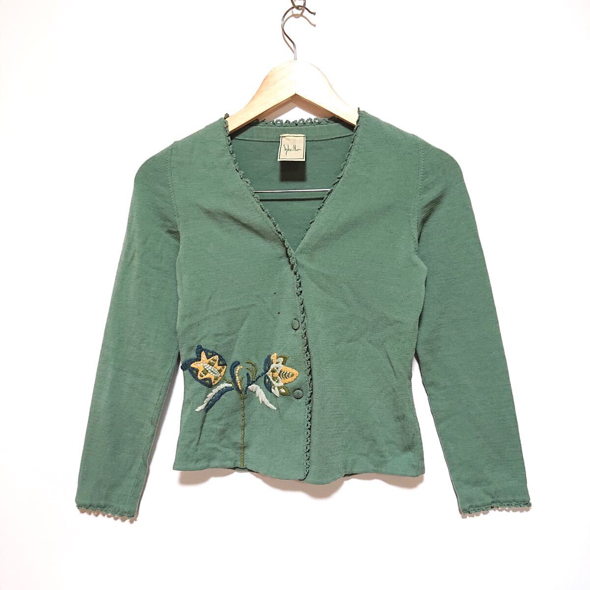 - h137gg Sybilla(シビラ)サイズM 長袖カーディガン カーキ レディース 花刺繍 かわいい ウール混 おしゃれ Vネック 古着 カジュアル