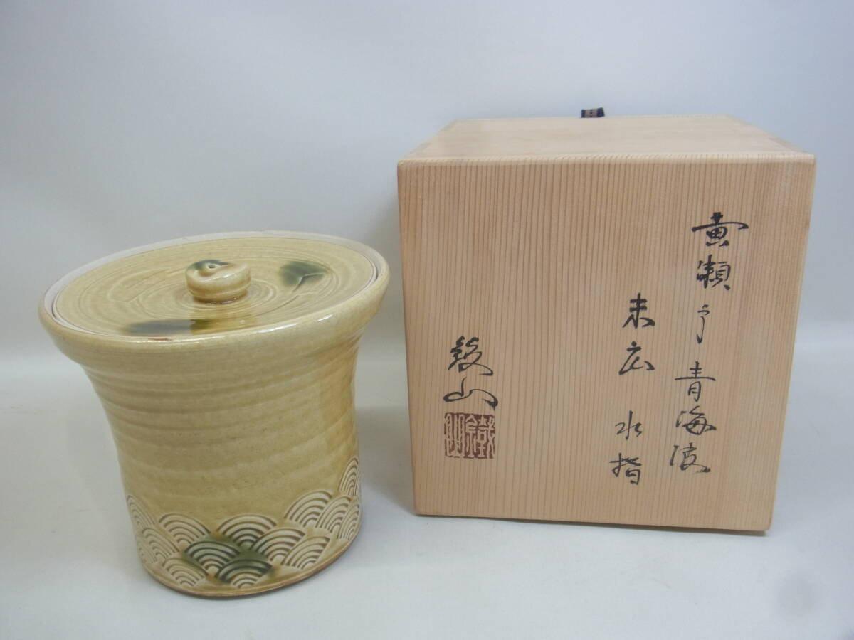 > ★茶道具 黄瀬戸 青海波 末広水指 松本鉄山 鐵山 共箱あり 水指 水差し 茶の湯 茶器 陶磁 陶器 瀬戸物 伝統工芸 在銘 現状 80