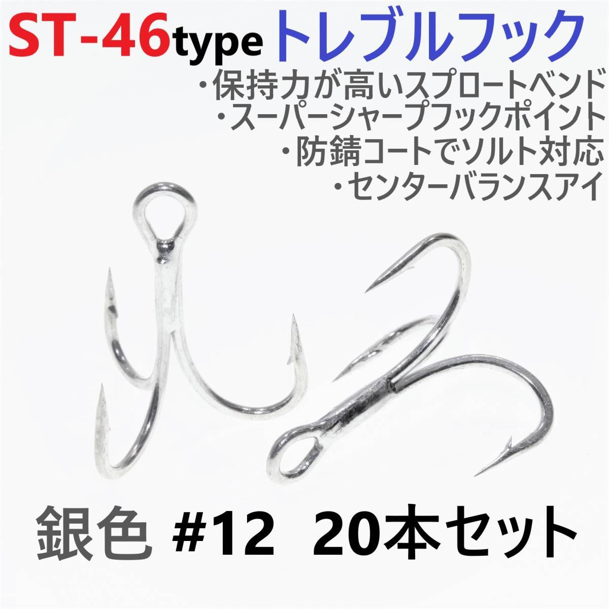 - 【送料150円】ST-46タイプ防錆トレブルフック シルバー#12 20本セット 高品質ルアーフック スプロートベンド ソルト対応 トリプルフック